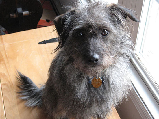 My dog Snuffles is terrier mix called a schnoodle, which is a mix of schnauzer and poodle. My son Jake and I adopted Snuffles in October 2006 from the Connecticut Humane Society in Westport. The name Snuffles comes from the Harry Potter books. I wanted to name him Sulley, after the character James P. Sullivan from the PIXAR movie Monsters Inc., because they are both furry and cute. But because I had named our two cats (Smithereens and Linus), Jake demanded that he be allowed to name the dog.